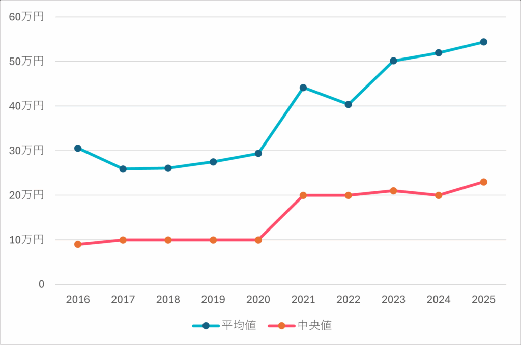 1案件に投資した金額の平均値と中央値についての過去10年の推移です。平均値は2023年に50万円を突破、その後も右肩上がりとなっています。中央値は2021年から4年間は約20万円で推移し、2025年は23万円になりました。